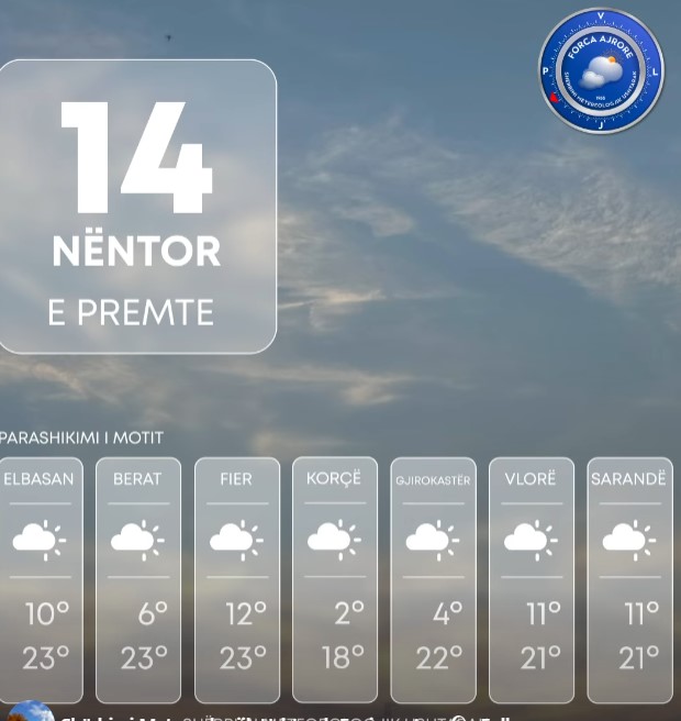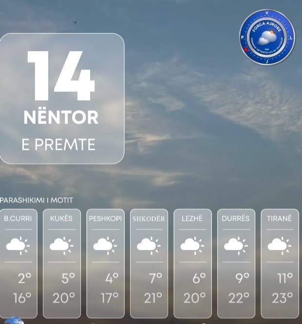 Këtë të premte, vendi ynë do të ndikohet nga kushte atmosferike të qëndrueshme. Moti parashikohet të jetë me kthjellime dhe vranësira kalimtare.