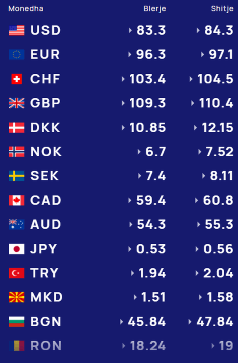 Për kursin e monedhave të tjera shihni tabelën e mëposhtme: