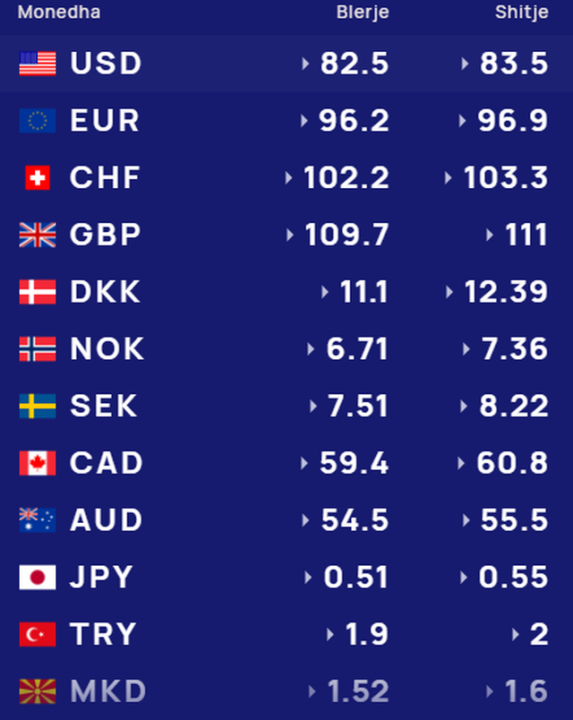 Për kursin e monedhave të tjera shihni tabelën e mëposhtme: