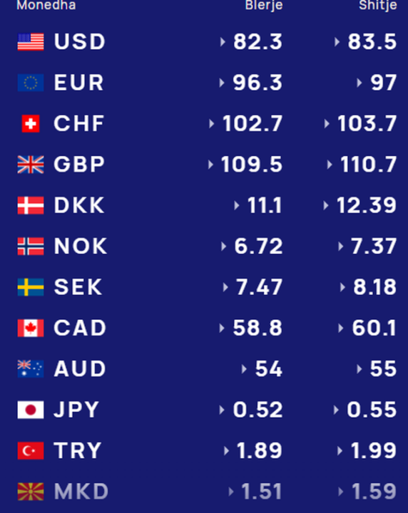 Për kursin e monedhave të tjera shihni tabelën e mëposhtme: