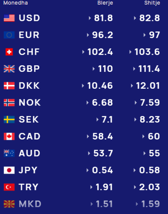 Për kursin e monedhave të tjera shihni tabelën e mëposhtme: