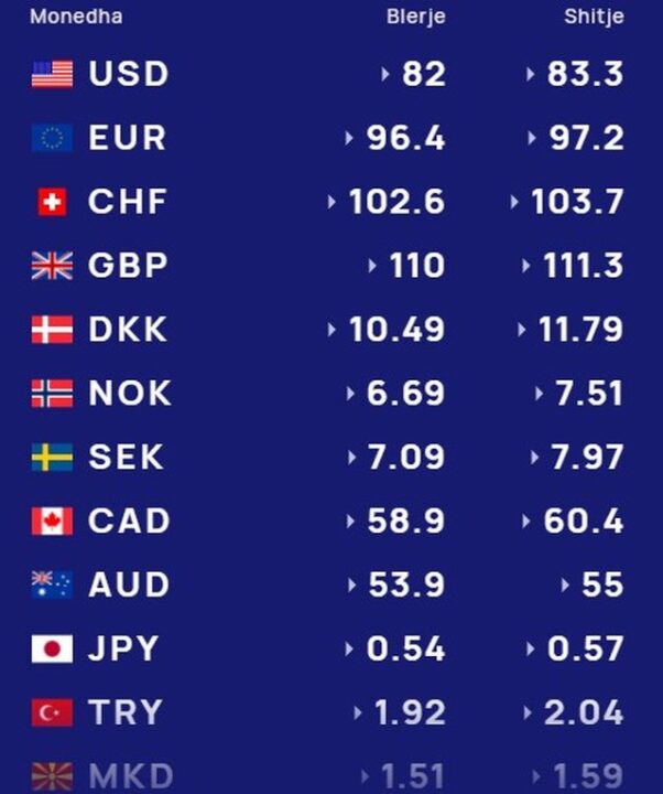Për kursin e monedhave të tjera shihni tabelën e mëposhtme: