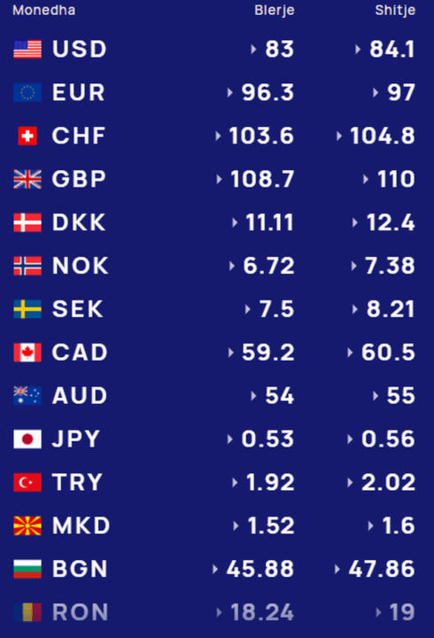 Për kursin e monedhave të tjera shihni tabelën e mëposhtme: