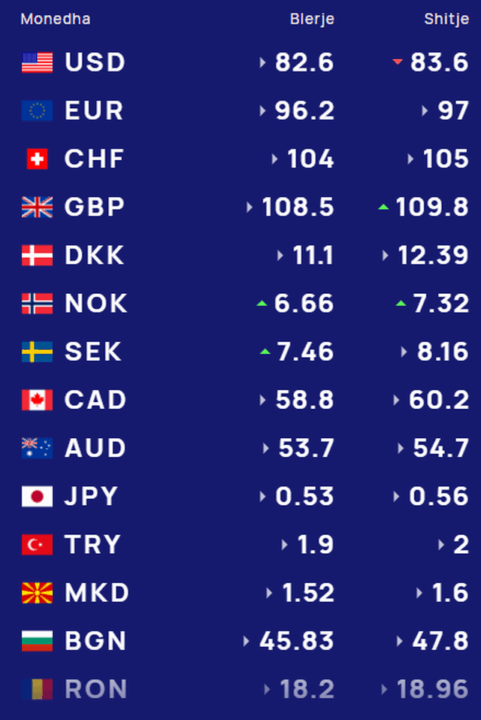 Për kursin e monedhave të tjera shihni tabelën e mëposhtme: