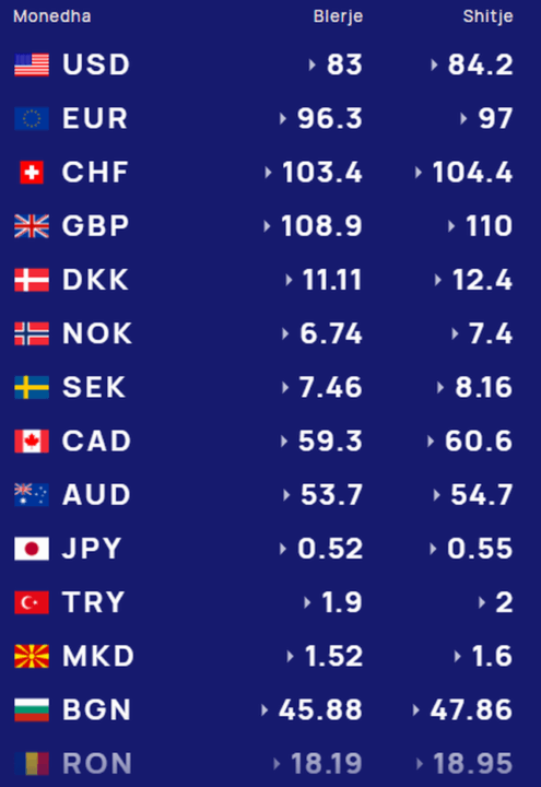Për kursin e monedhave të tjera shihni tabelën e mëposhtme: