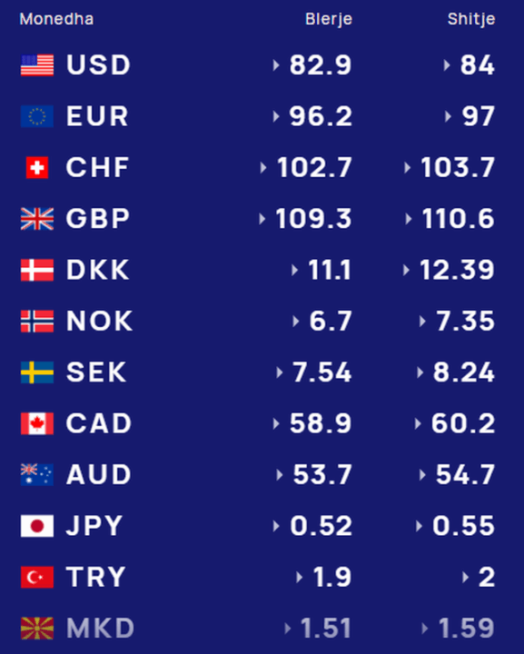 Për kursin e monedhave të tjera shihni tabelën e mëposhtme: