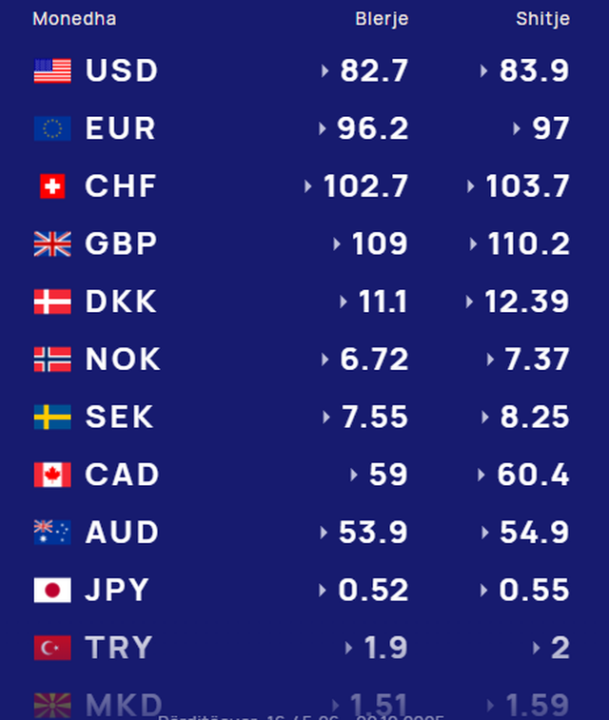 Për kursin e monedhave të tjera shihni tabelën e mëposhtme: