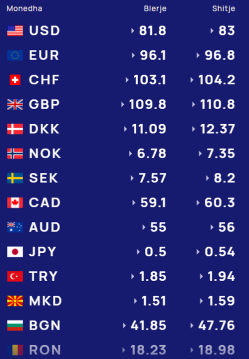 Për kursin e monedhave të tjera shihni tabelën e mëposhtme: