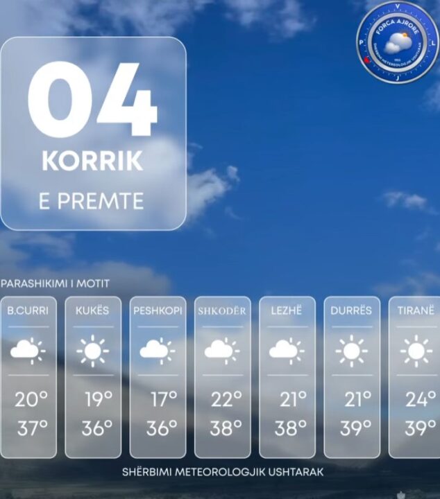 Vranësirat do të jenë të pakta dhe kalimtare, kryesisht në zonat malore, pa ndikim në situatën e përgjithshme atmosferike.