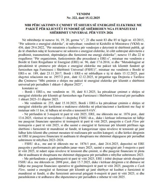 “Bazuar në të dhënat e deklaruara nga shoqëria, rezulton se çmimet e miratuara me vendimet nr. 10, datë 8.1.2025, dhe vendimin nr. 255, datë 15.10.2025, gjenerojnë të ardhura të cilat kanë mbuluar kostot e aktivitetit të shoqërisë, duke garantuar ushtrimin e një aktiviteti normal operacional, aktivitet i cili pritet të vijojë në të njëjtën formë dhe për vitin 2026. Në mënyrë që shoqëria FSHU sh.a., edhe për vitin 2026, të mundet të realizojë aktivitetin për të cilin është licencuar, bëhet e domosdoshme të vijojë faturimin, bazuar në çmimet e miratuara nga ERE”, thuhet në vendimin e ERE të publikuar në Fletoren Zyrtare.
