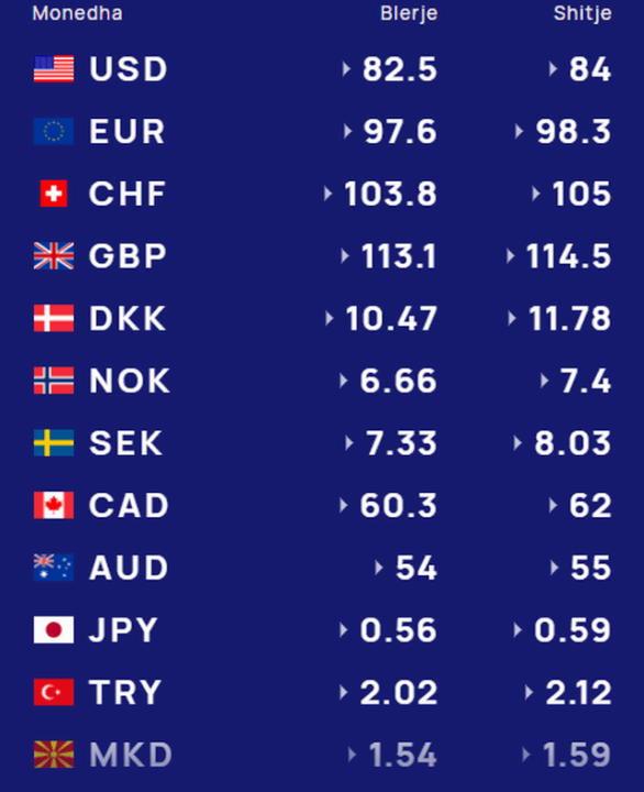 Për kursin e monedhave të tjera shihni tabelën e mëposhtme: