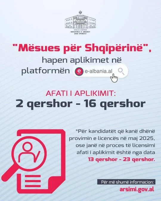 Janë hapur aplikimet për “Mësues për Shqipërinë” 2025, në platformën “e- Albania”.