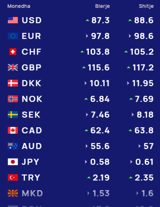 Për kursin e monedhave të tjera shihni tabelën e mëposhtme: