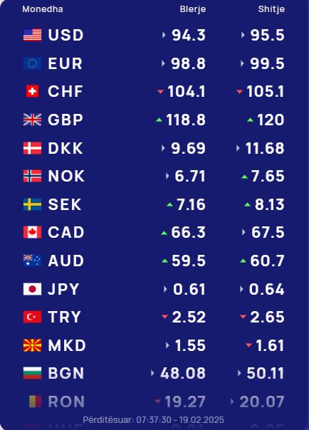 Ndërkohë monedha evropiane euro do blihet me 98.8 lekë dhe do shitet me 99.5 lekë. Franga zvicerane sot në tregun shqiptar do blihet me 104.1 lekë dhe do shitet me 105.1 lekë. Ndërsa paundi britanik do blihet me 118.8 lekë dhe do shitet me 120 lekë.
