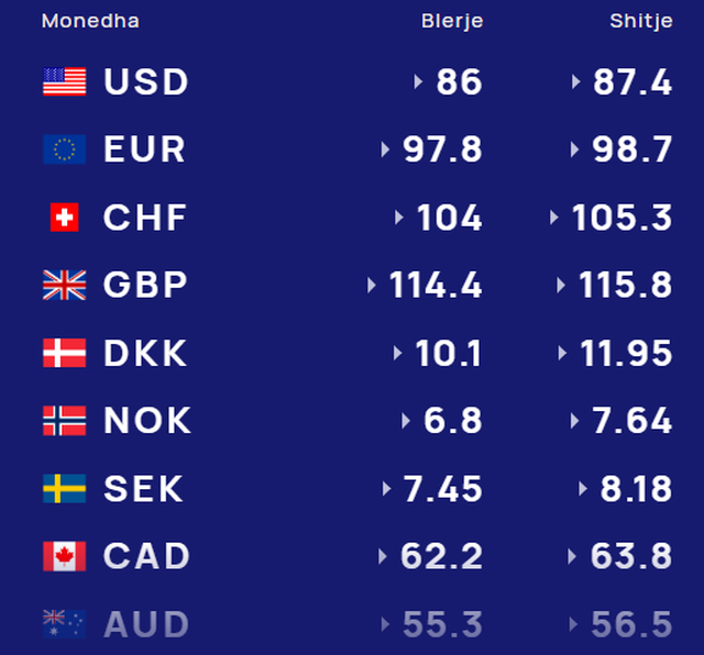 Për kursin e monedhave të tjera shihni tabelën e mëposhtme: