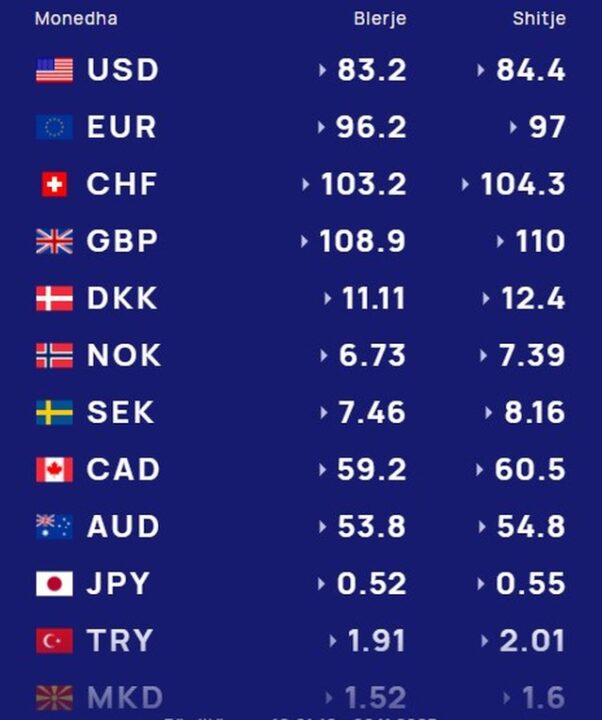 Për kursin e monedhave të tjera shihni tabelën e mëposhtme: