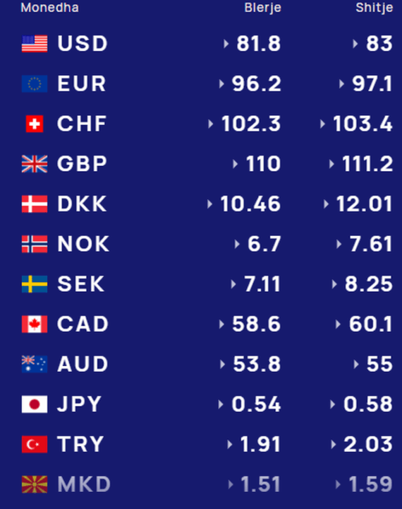 Për kursin e monedhave të tjera shihni tabelën e mëposhtme: