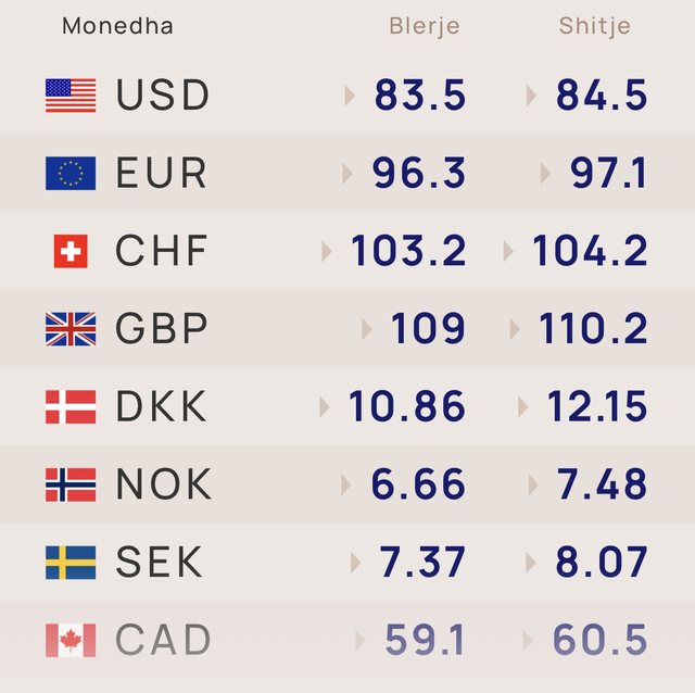 Për kursin e monedhave të tjera shihni tabelën e mëposhtme: