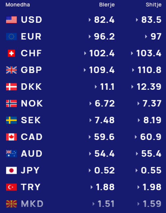 Për kursin e monedhave të tjera shihni tabelën e mëposhtme: