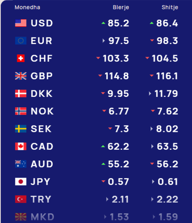 Për kursin e monedhave të tjera shihni tabelën e mëposhtme: