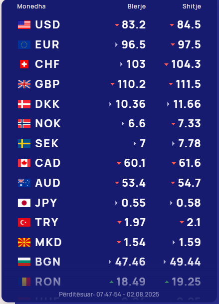 Ndërsa paundi britanik do blihet me 111.4 lekë dhe do shitet me 113 lekë.