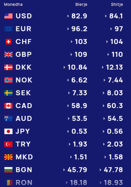 Për kursin e monedhave të tjera shihni tabelën e mëposhtme: