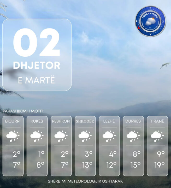 Ditën e martë vendi ynë do të jetë në ndikim të masave ajrore të paqëndrueshme. Moti parashikohet të jetë me alternime kthjellimesh e vranësira mesatare deri të dendura.
