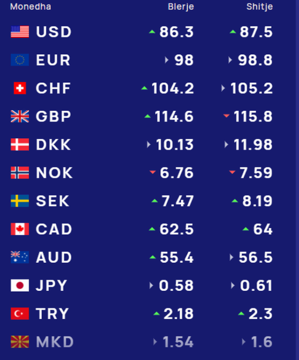 Për kursin e monedhave të tjera shihni tabelën e mëposhtme: