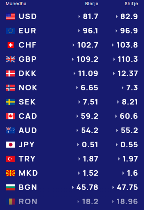 Për kursin e monedhave të tjera shihni tabelën e mëposhtme:
