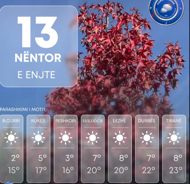 Ditën e sotme vendi ynë do të ndikohet nga kushte atmosferike të qëndrueshme. Orët me diell do të mbizotërojnë në pjesën më të madhe të vendit.