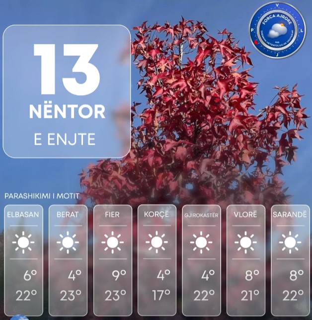 Sipas Shërbimit Meteorologjik Ushtarak, era do të fryjë me drejtim veriperëndim – verilindje me shpejtësi mesatare 5 m/s, ndërsa përgjatë vijës bregdetare e zonave luginore era fiton shpejtësi 10 m/s.