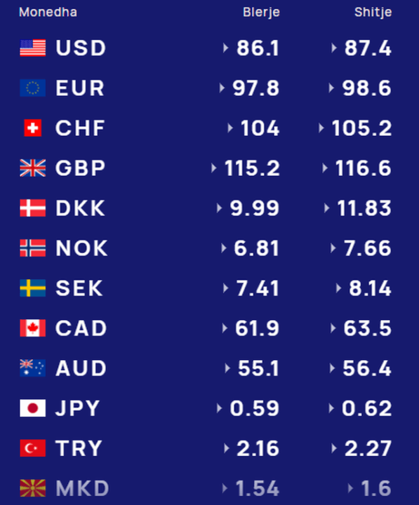 Për kursin e monedhave të tjera shihni tabelën e mëposhtme: