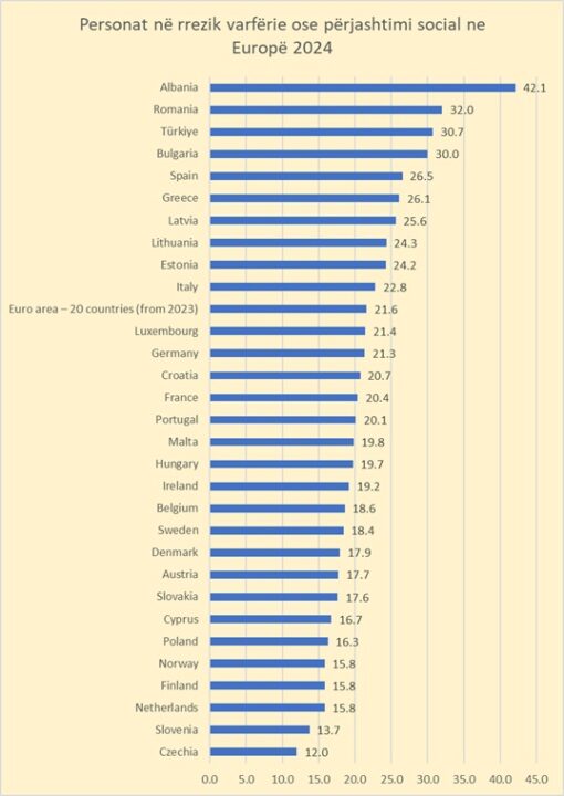 Sipas të dhënave të fundit të Eurostat Shqipëria kryesoi Europën për nivelin e lartë të popullsisë rreth 42 për qind që është në rrezik për të qenë e varfër pasi vuan nga një formë e rëndë e përjashtimit social me 2024 (Europa të dhëna 2024, Shqipëria 2023).