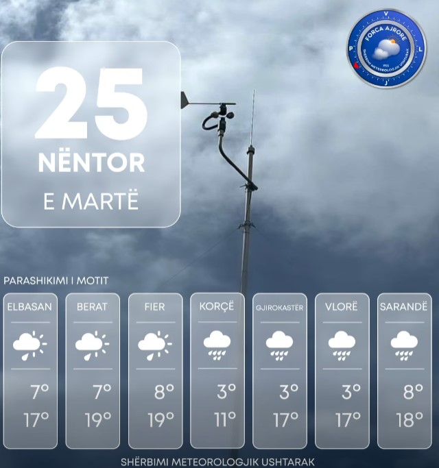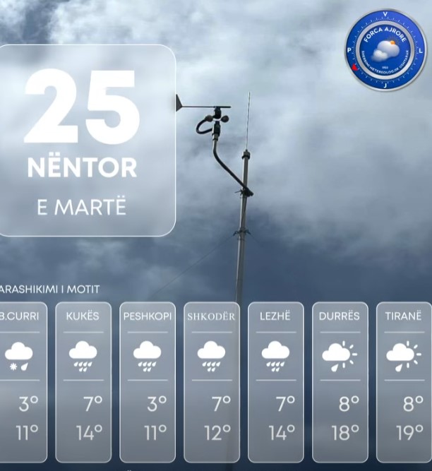 Këtë të martë, vendi ynë do të ndikohet nga kushte atmosferike të paqëndrueshme. Moti parashikohet të jetë me vranësira mesatare e të dendura si dhe alternime kthjellimesh të herëpashershme.