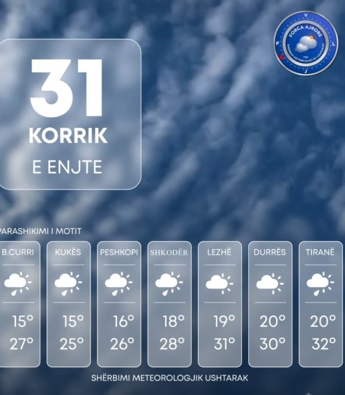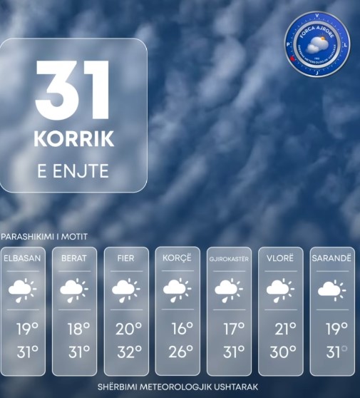 Vendi ynë do të jetë nën ndikimin e një situate atmosferike të paqëndrueshme. Moti do të shfaqet me kthjellime të herëpashershme, kryesisht në zonat veriperëndimore dhe jugperëndimore, por që do të pasohet nga shtim gradual të vranësirave mesatare deri të dendura, veçanërisht në relievet e larta kodrinore dhe malore të vendit.
