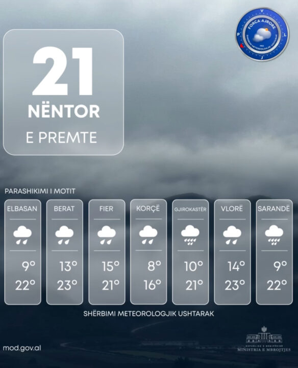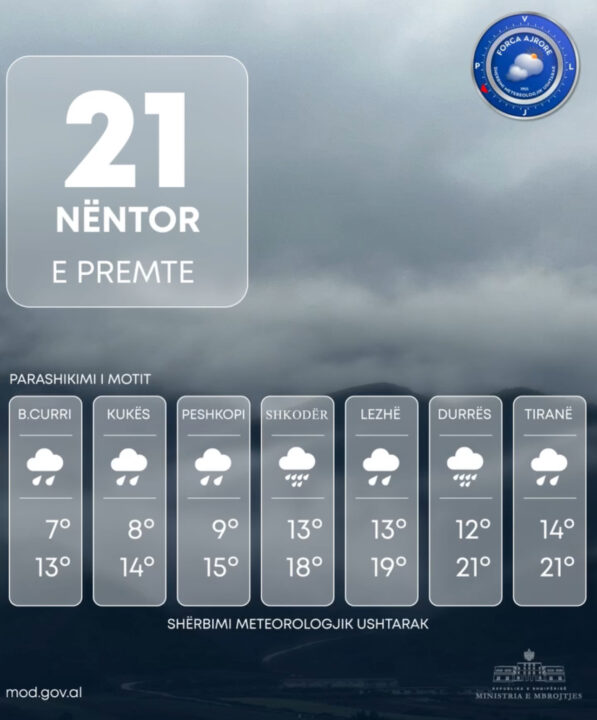Ditën e premte vendi ynë do të ndikohet nga kushte atmosferike të paqëndrueshme. Moti parashikohet të jetë me vranësira mesatare deri të dendura.