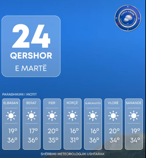 Temperaturat minimale do të jenë 15 gradë Celsius, ndërsa maksimale 36 gradë.
