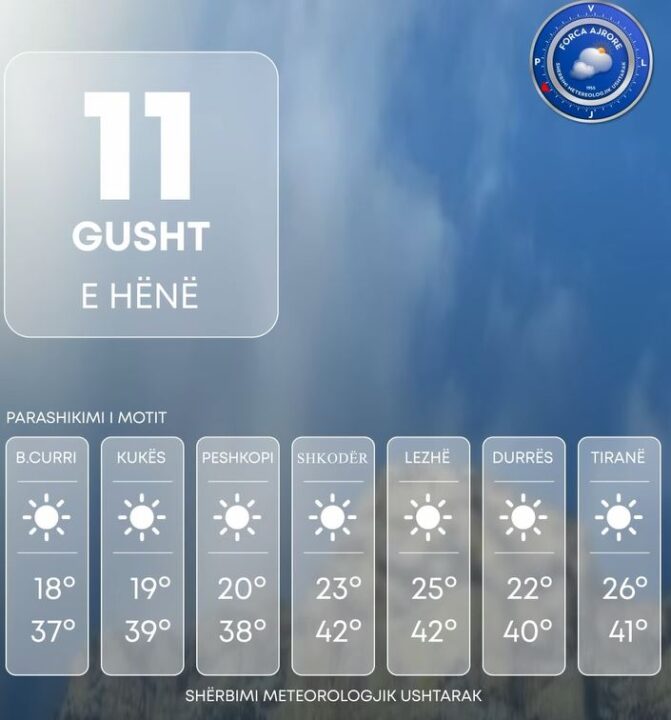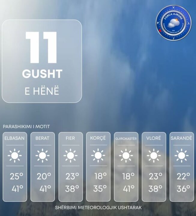 Era do të fryjë me drejtim veriperëndim – verilindje me shpejtësi mesatare 6 m/s, ndërsa në zonat luginore dhe përgjatë vijës bregdetare hera-herës do të fitojë shpejtësi 8-12m/s.
