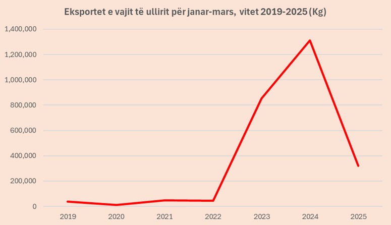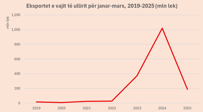 Për muajt janar-mars 2025 sipas të dhënave të Doganave u eksportuan rreth 322 ton vaj ulliri. Krahasuar me të njëjtën periudhë të vjetshme eksportet e vajit të ullirit janë ulur 75%.