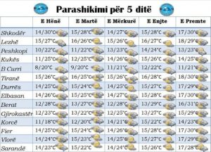 Në orët e mesditës dhe kryesisht pasdite vranësirat do të shoqërohen me reshje shiu të herëpashreshme me intensitet të ulët e lokalisht përgjatë relieveve malore me intensitet deri mesatar.