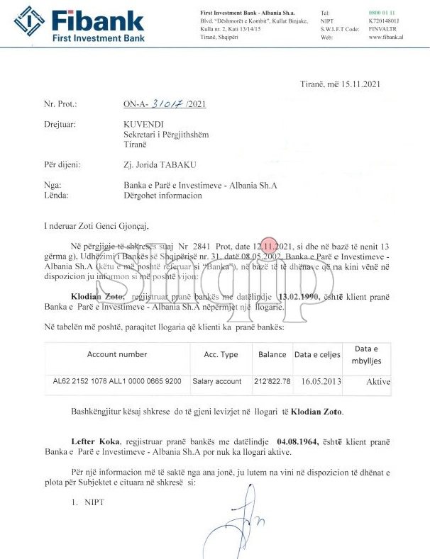 Kjo bankë u ka kthyer përgjigje deputetëve të opozitës përmes një shkrese me disa faqe, ku dërgon të dhëna personale për Klodian Zoton. Të dhënat që kanë rrjedhur nga Komisioni Hetimor tregojnë numrin e llogarisë, ditëlindjen dhe gjendjen e llogarisë, që sipas legjislacionit në fuqi klasifikohen si sekret bankar.