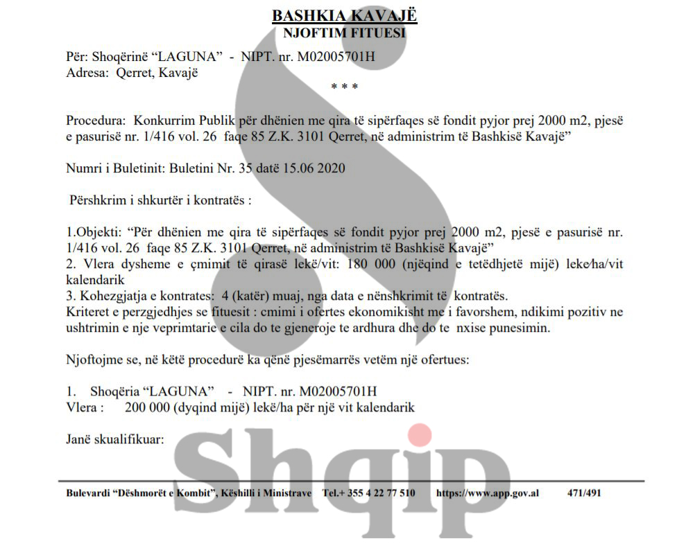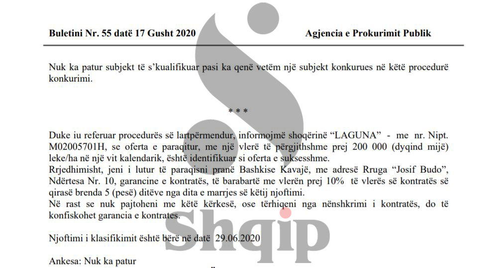Megjithatë, në garë ka qenë vetëm një kompani, pikërisht shoqëria “LAGUNA” me adresë pikërisht në Qerret, Kavajë. Në dokumente thuhet se kompania “LAGUNA”, ka nipt me nr. M02005701H. “Shqip” verifikoi në Qendrën Kombëtare të Biznesit për këtë kompani, ku çdo kush mund të aksesojë të dhënat që nuk janë sekret. Çuditërisht, me këtë numër nipti nuk rezulton asnjë kompani e regjistruar në Qendrën Kombëtarë të Biznesit.