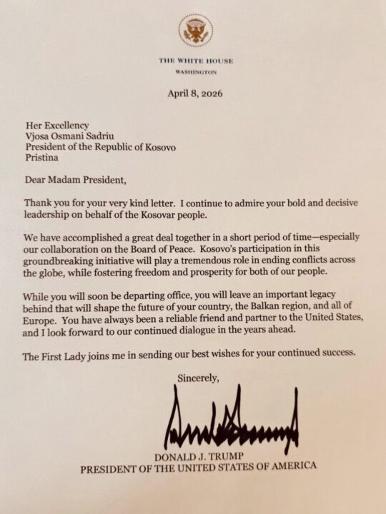 “E nderuar Znj. Presidente! Faleminderit për letrën tuaj shumë dashamirëse. Vazhdoj të admiroj lidershipin tuaj të guximshëm dhe vendimtar në emër të popullit të Kosovës.