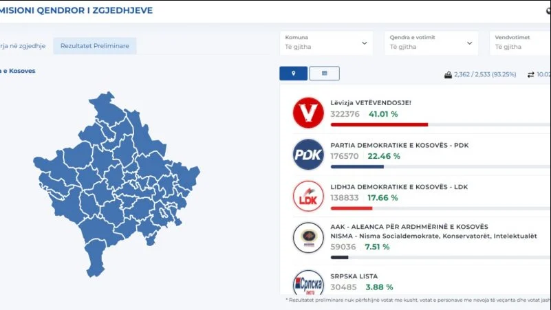 Pas numërimit të të gjitha kutive, 2533 të tilla, ashtu si edhe pritej Lëvizja Vetëvendosje renditet në krye me numrin më të madh të votave, por deri tani rezulton të ketë siguruar vetëm 41.14% të tyre, pa e përsëritur dot suksesin e zgjedhjeve të vitit 2021, kur siguroi pa shumë mundim mbi 50 për qind të votave dhe krijimin e rehatshëm të qeverisë.