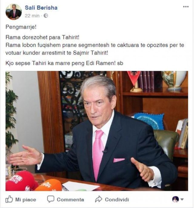 Përmes një statusi në “Facebook”, Berisha, shkruan se Rama i kapur peng nga Tahiri, po kërkon të ‘blejë’ deputetë të caktuar të opozitës që të votojnë kundër arrestimit të ish-ministrit të tij.