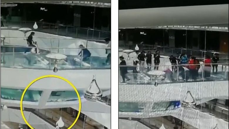 Në episodin e kapur nga kamerat në një qendër tregtare në qytetin Zheijang, gruaja rrëzohet në akuariumin ku ndodheshin dy peshkaqenë rreth 2 metra të gjatë.