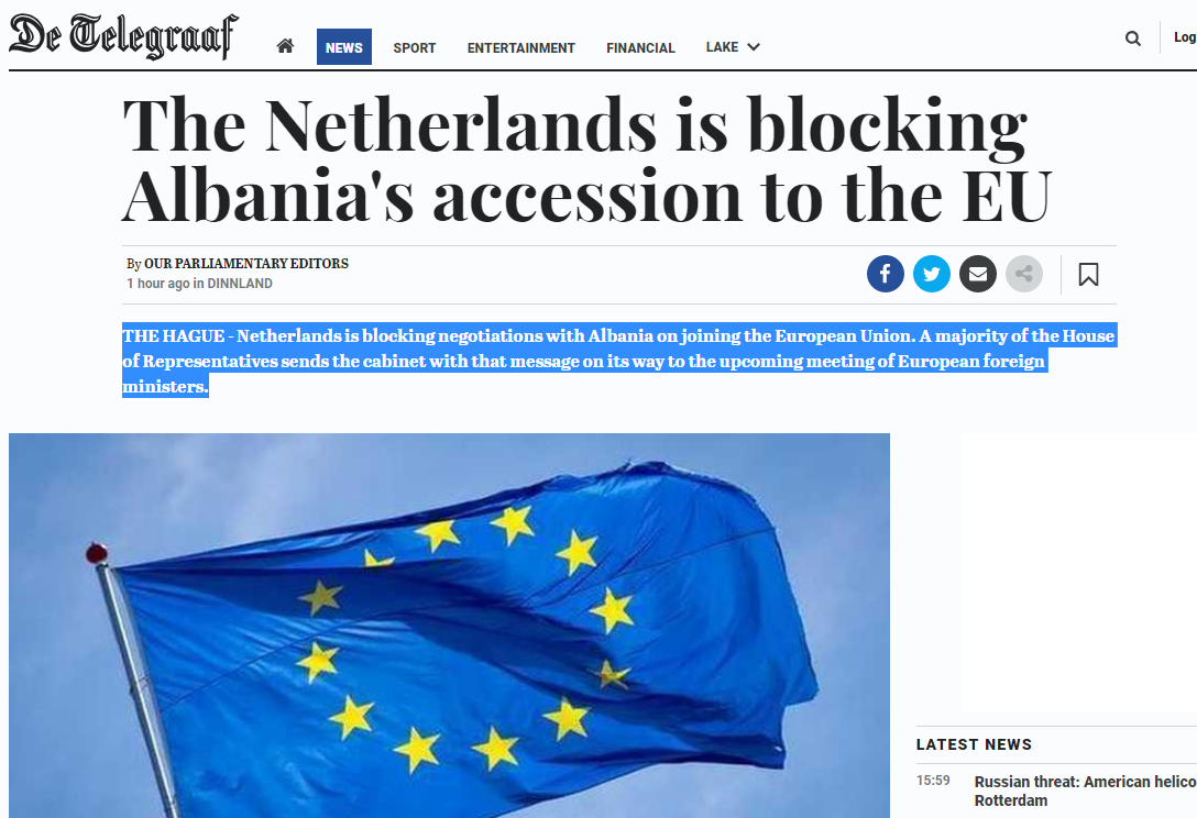“Shumica e partive të parlamentit holandez e dërgon qeverinë e Holandës në Bruksel me mesazhin e qartë për të mos votuar pro hapjes së negociatave. Shqipëria, vendi ballkanik i goditur nga varfëria u bë kandidat për anëtarësim në BE disa vjet më parë me miratimin e Dhomës së Përfaqësuesve. Komisioni Europian tani dëshiron të nisë negociatat për anëtarësim me Shqipërinë dhe Maqedoninë. KE madje përmend një vit në të cilin anëtarësimi duhet të jetë një fakt 2025”, shkruan media holandeze.