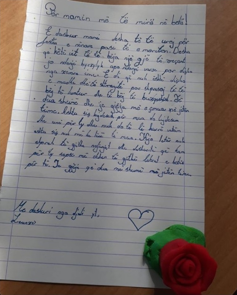 Cila nënë nuk do të emocionohej nëse do të merrte për 8 Mars një dhuratë si ajo që ka marrë këngëtarja Anjeza Branka?! Ajo ka publikuar një letër që i ka bërë i biri, shoqëruar edhe me një trëndafil të kuq të krijuar me plastelinë.