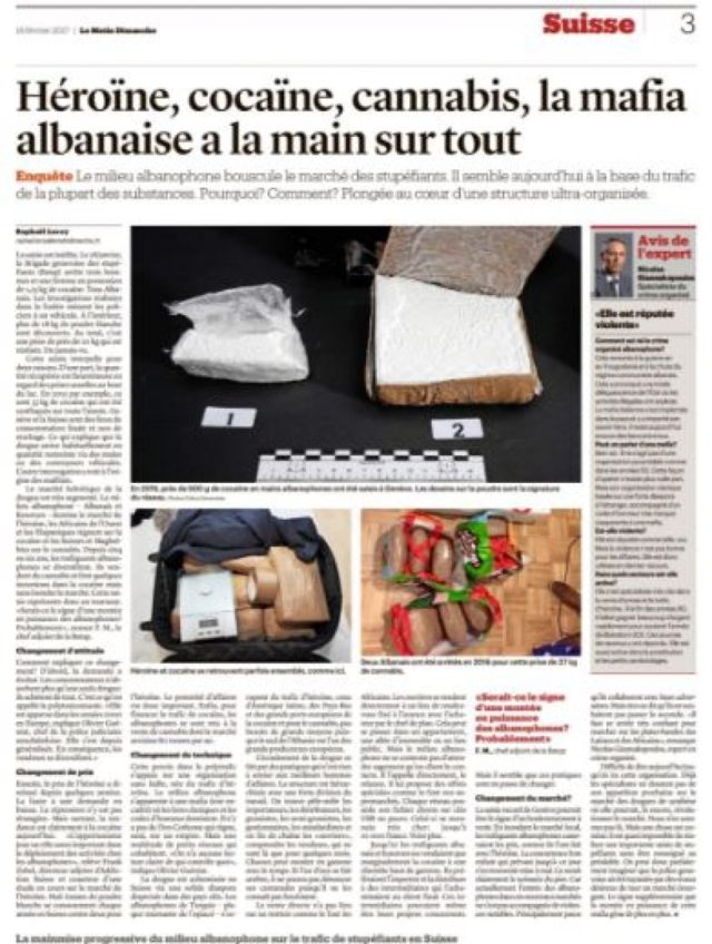 “Mafia shqiptare në Zvicër drejton trafikun e të gjitha llojeve të drogave”, është titulli kryesor i një shkrimi në gazetën zvicerane “Le Matin Dimanche”. Në artikull thuhet se shpërndarja e drogës ka ndryshuar tregun e Zvicrës. Heroina, kokaina dhe hashashi, janë tashmë në duart e shqiptarëve të Kosovës dhe Shqipërisë.