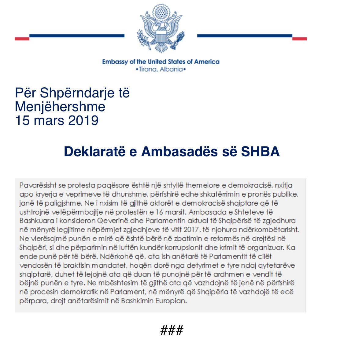 Aty gjithashtu theksohet se “Ambasada e Shteteve të Bashkuara i konsideron Qeverinë dhe Parlamentin aktual të Shqipërisë të zgjedhura në mënyrë legjitime nëpërmjet zgjedhjeve të vitit 2017, të njohura ndërkombëtarisht”.